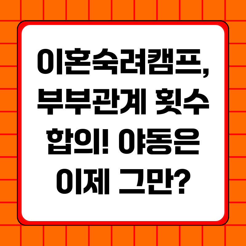 8월 28일 방송된 JTBC '이혼숙려캠프'에서는 14기 부부의 최종 조정 과정이 공개되었습니다. 핵심 쟁점은 부부관계 횟수였죠. 아내는 주 3회를 원했지만, 남편은 피로 누적을 이유로 난색을 보였습니다. 서장훈의 중재로 결국 월 10회로 합의를 보았고, 남편은 혼인 유지 조건으로 야동을 끊겠다는 약속까지 했습니다. 아내는 이번 캠프 참여가 "인생 최고의 선택"이었다며 소감을 밝혔습니다.