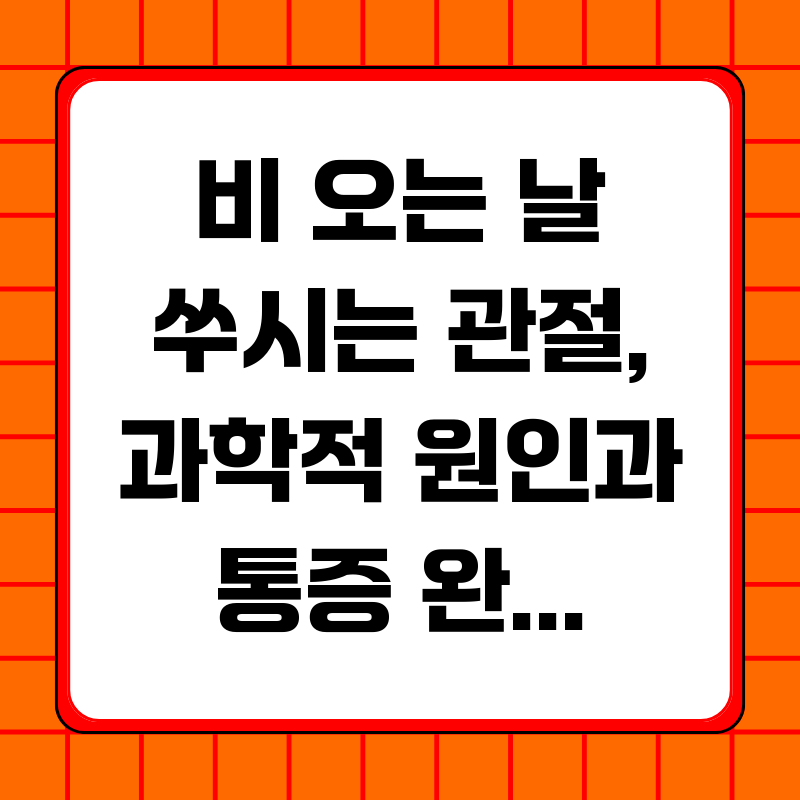 궂은 날씨만 되면 어김없이 찾아오는 관절 통증, 어르신들만의 이야기가 아닙니다. 습하고 기압이 낮은 날씨에 유독 심해지는 관절의 불편함은 많은 이들이 공감하는 현상이죠. 단순한 기분 탓으로 치부하기에는 그 고통이 너무나 생생합니다. 그렇다면 정말 날씨와 관절 통증은 연관이 있는 걸까요? 있다면 그 이유는 무엇일까요? 이 글에서는 비 오는 날 발생하는 관절 통증의 과학적 근거를 파헤치고, 일상생활에서 실천할 수 있는 효과적인 통증 완화 방법을 제시합니다. 이제 더 이상 날씨 탓만 하지 마시고, 과학적인 해결책을 찾아 건강한 관절을 지켜보세요.➡️ 원본 포스팅( 비 오는 날 관절 통증, 과학적으로 ... ) 보러가기비가 오기 전, 우리는 흔히 기압 저하를 경험합니다. 이러한 기압 변화는 관절 내부의 압력 불..